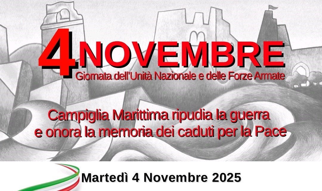 Il Comune di Campiglia Marittima celebra la giornata dell'Unità nazionale e delle Forze armate martedì 4 novembre con il seguente programma, sottolineando il valore della memoria dei caduti per la pace e l'articolo 11 della Costituzione che ripudia la guerra.